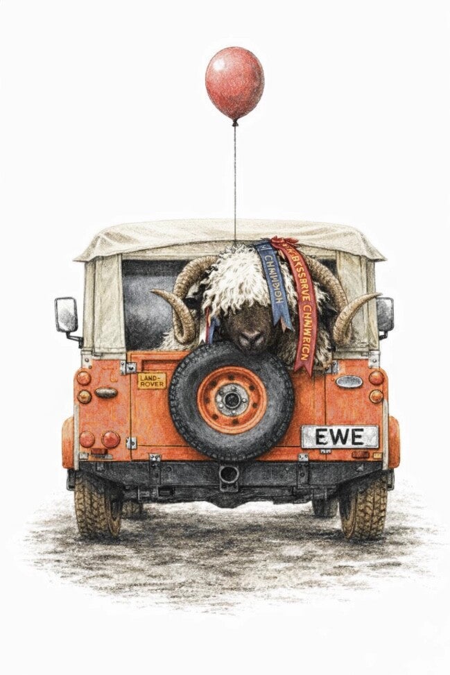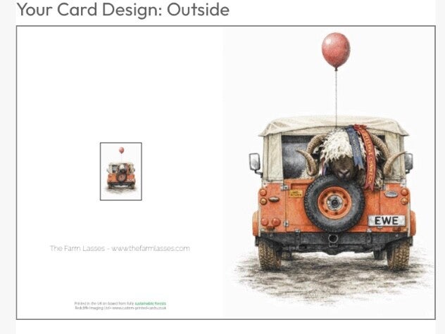 The Farm Lasses Greetings Card. Land Rover & Valais Blacknose Ewe. Birthday humour. Greeting Card 127mm x 178mm portrait, comes with brown craft envelope.