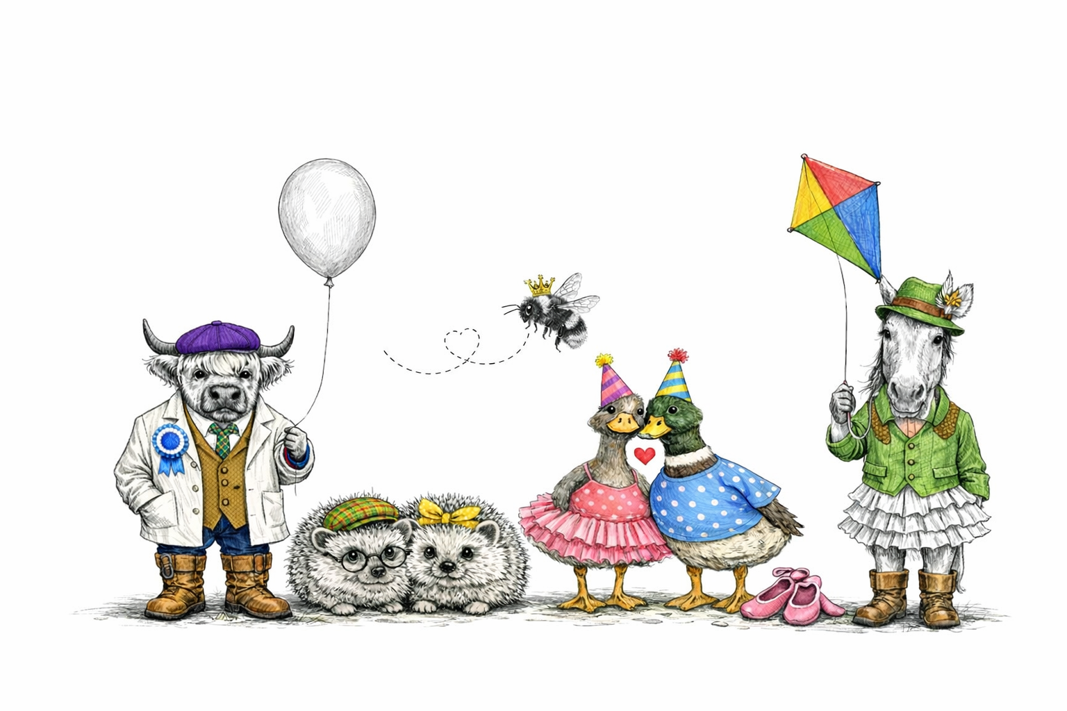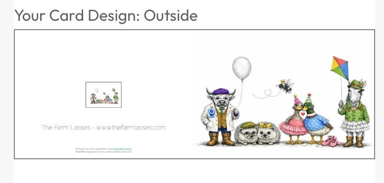 The Farm Lasses Greetings Card. Agricultural humour, including lady horse, ducks, hedgehogs, prize winning highland bull and a bee. Either for Birthday or all occasions.