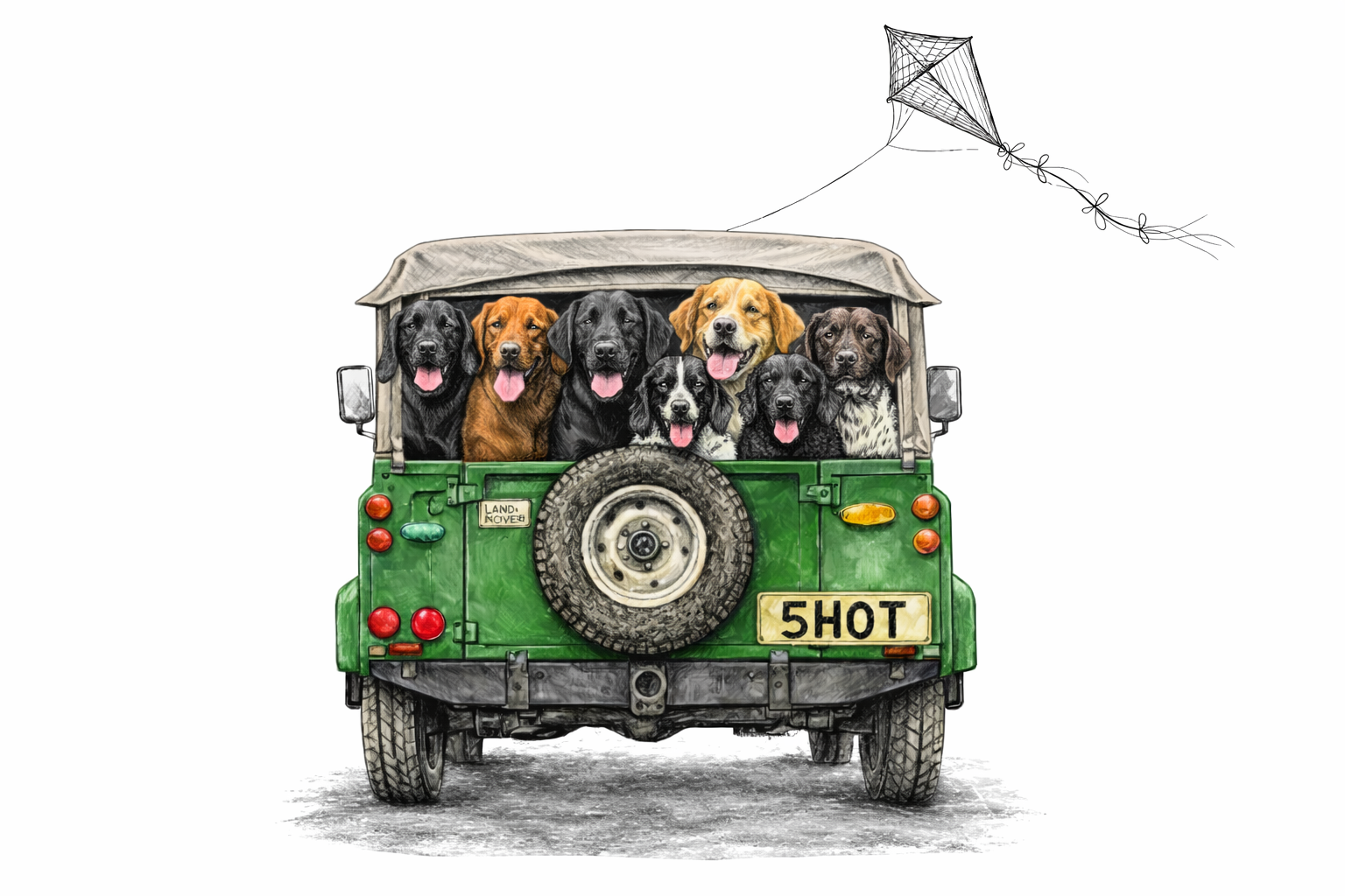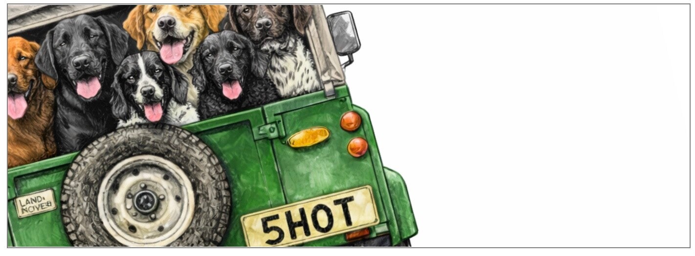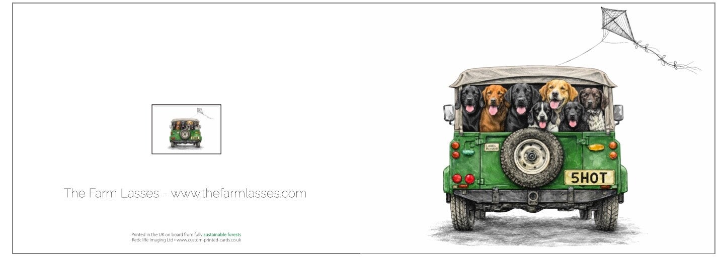 Land Rover, shooting dogs, Game keeping card for Birthday or all occasions. 127mm x 178mm Landscape with brown craft envelope.