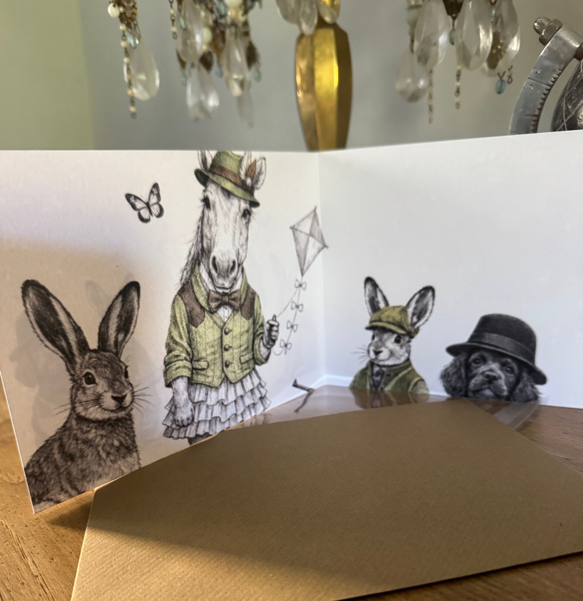 Farm humour, Land Rover, Sheep, Lambs, Border Collie Greetings Card. 127mm x 178mm Landscape with brown craft envelope.