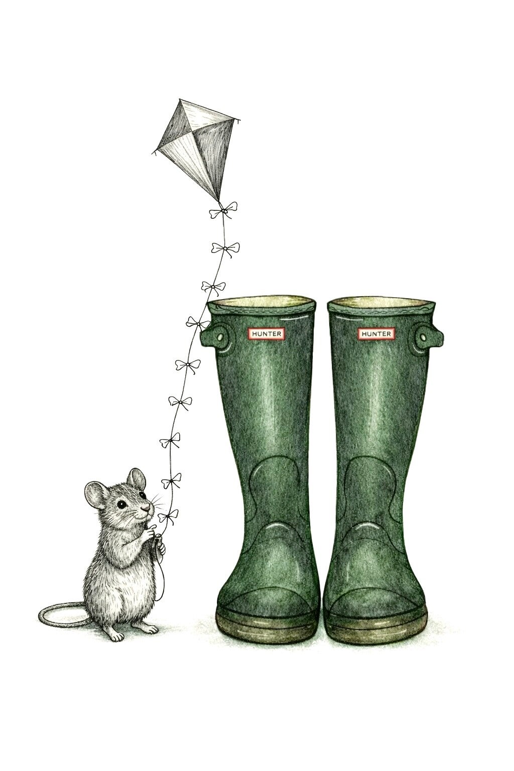 The Farm Lasses Hunter Wellies and mouse flying a kite greetings card for all occasions.