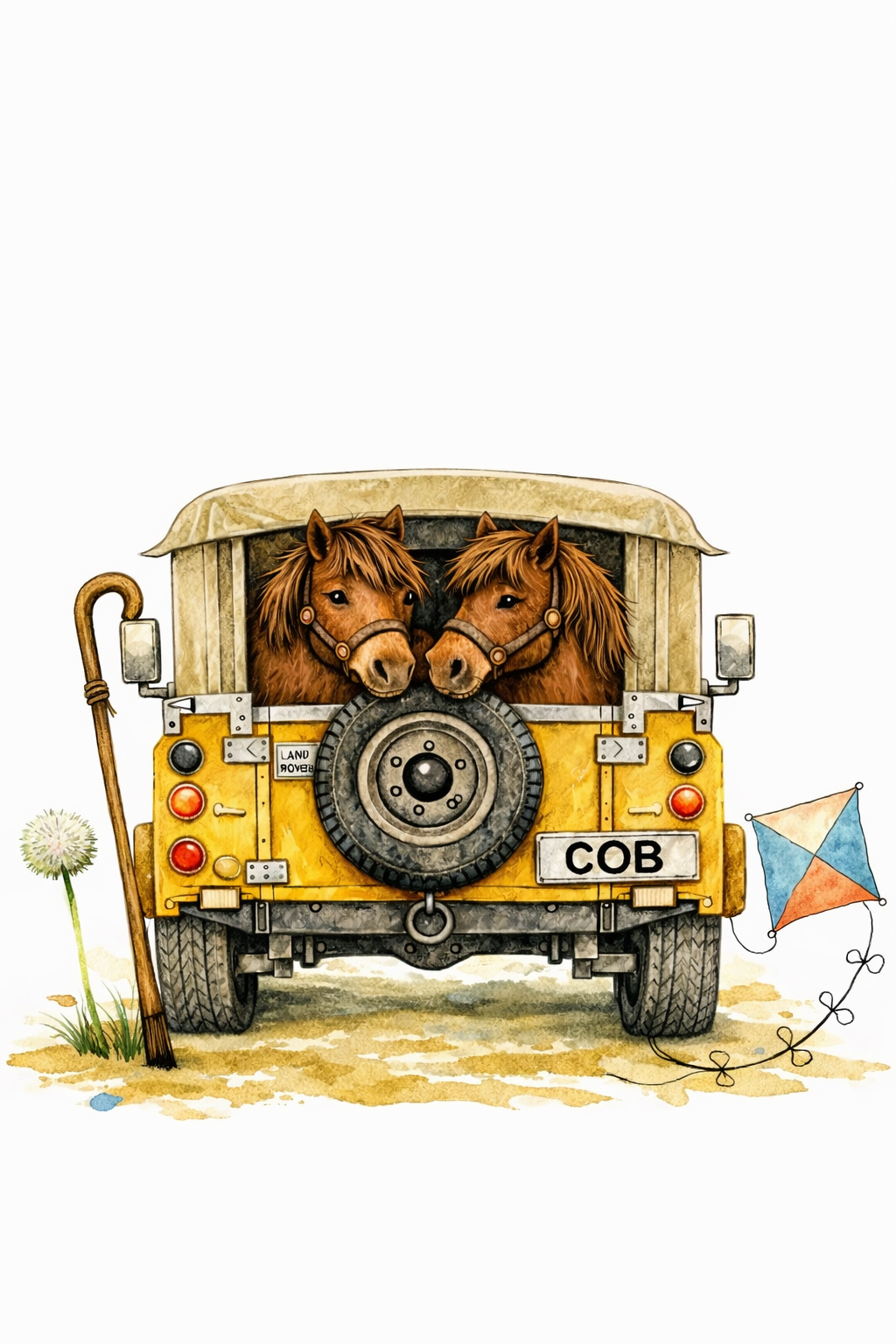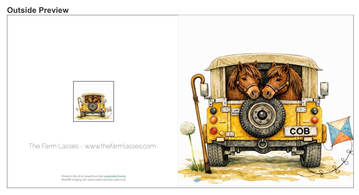 The Farm Lasses yellow Land Rover And Horses Greetings card.